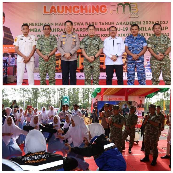 PEKANBARU/// SHR – Kodam XIX/Tuanku Tambusai menunjukkan komitmennya dalam mendukung pembinaan karakter dan wawasan kebangsaan generasi muda dengan berpartisipasi dalam kegiatan Launching Penerimaan Mahasiswa Baru (PMB) Universitas Lancang Kuning (Unilak) Tahun Akademik 2026/2027, yang dirangkaikan dengan Lomba Olahraga Baris Berbaris (LOBB) U-19 & Unilak Cup serta Sosialisasi Wawasan Kebangsaan.